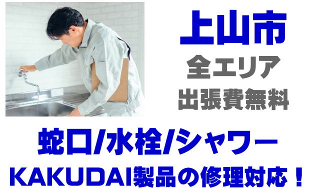 上山市で水栓メーカーKAKUDAIの修理業者をお探しなら当社までお気軽にお問い合わせください。蛇口の水漏れ、シャワーの故障などカクダイ製に関するトラブルなら何でもご相談ください。