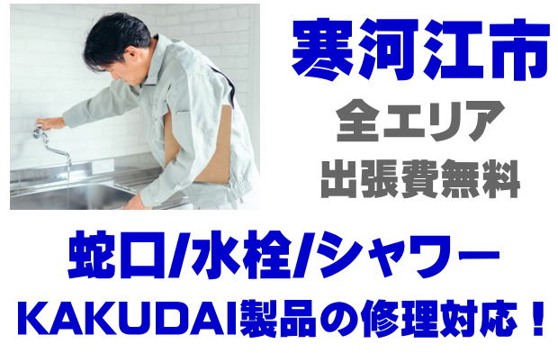 寒河江市で水栓メーカーKAKUDAIの修理業者をお探しなら当社までお気軽にお問い合わせください。蛇口の水漏れ、シャワーの故障などカクダイ製に関するトラブルなら何でもご相談ください。